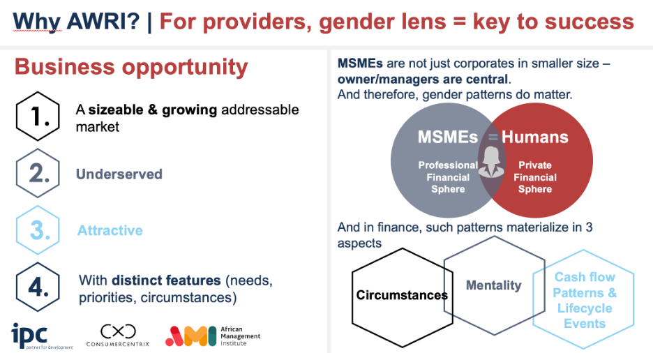 In the AWRI program – as in most of our work – we were tasked with working with for-profit financial service providers. There is now a strong basis of evidence that women and women’s businesses constitute a clear business opportunity. But business bankers tend to ask why they’d need to become “gender-intelligent” in their work. Is not a business and a leasing contract a leasing contract, whoever sits on the client side of the relationship?